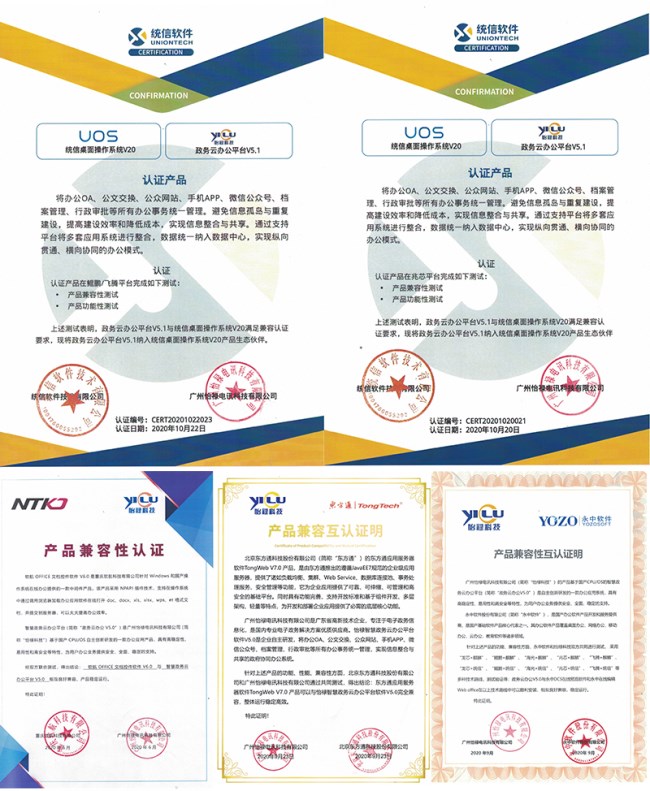 2020年8月至10月,怡禄科技陆续和统信UOS、东方通、永中Office、软航NKTO进行共同测试认证,经过系统安全测试、权限过滤测试、大数据并发测试、流程中心测试等环节,表明政务云办公平台已经达到国产化环境下的兼容性要求和可靠性要求,能够满足信息化建设的需求。