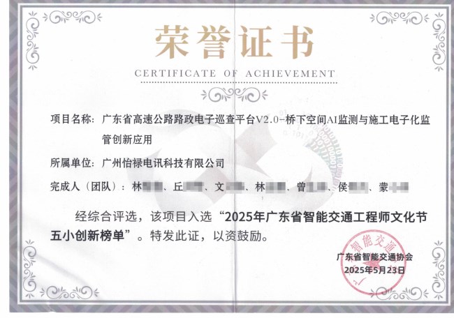 飞艇168官方开奖历史再传捷报!在2025年广东省智能交通协会文化节上,我司自主研发的"路政电子巡查平台桥下空间AI监测与施工电子化监管创新应用"项目,从众多优秀参评项目中脱颖而出,荣获"五小创新发明"奖项!